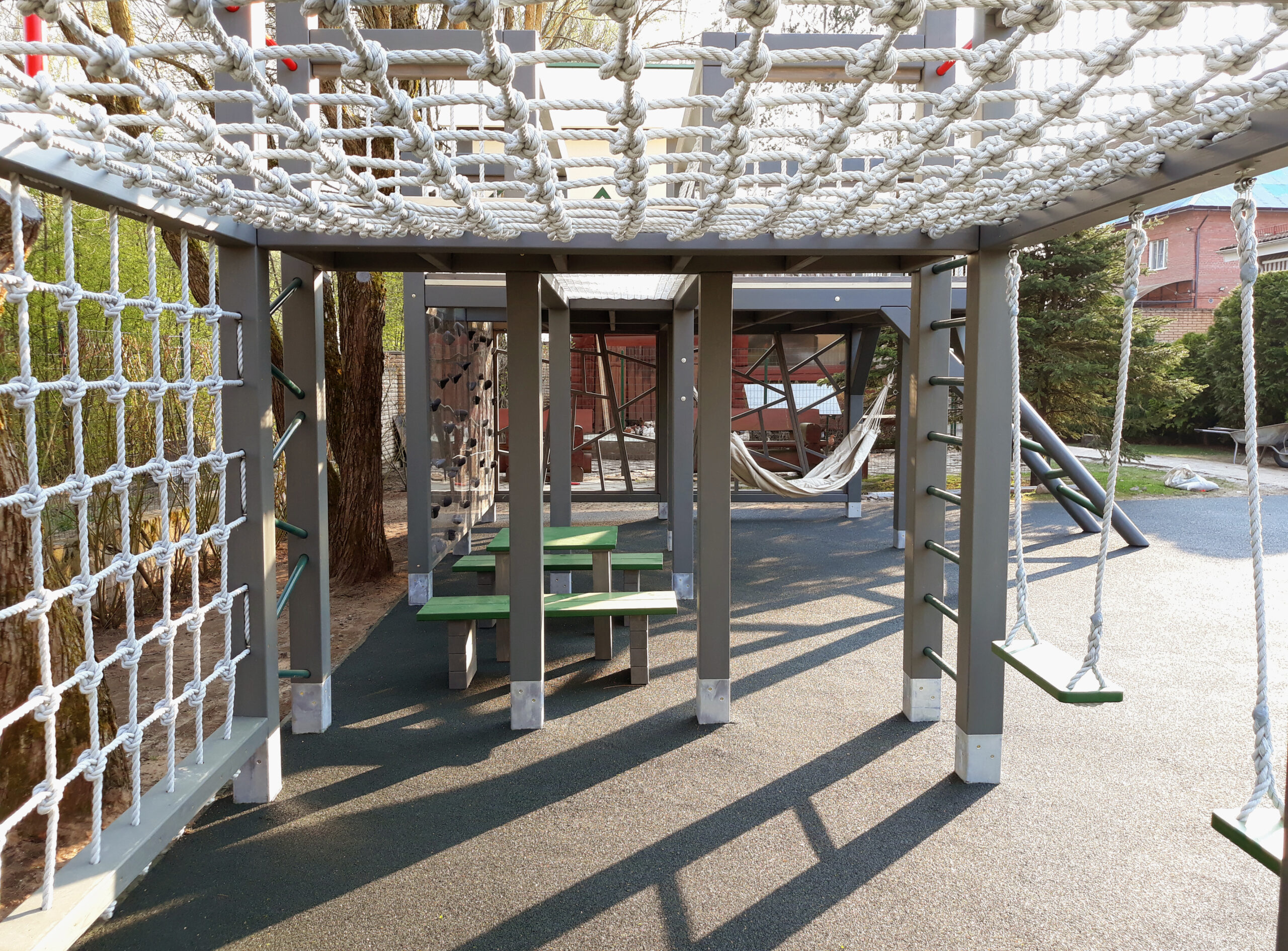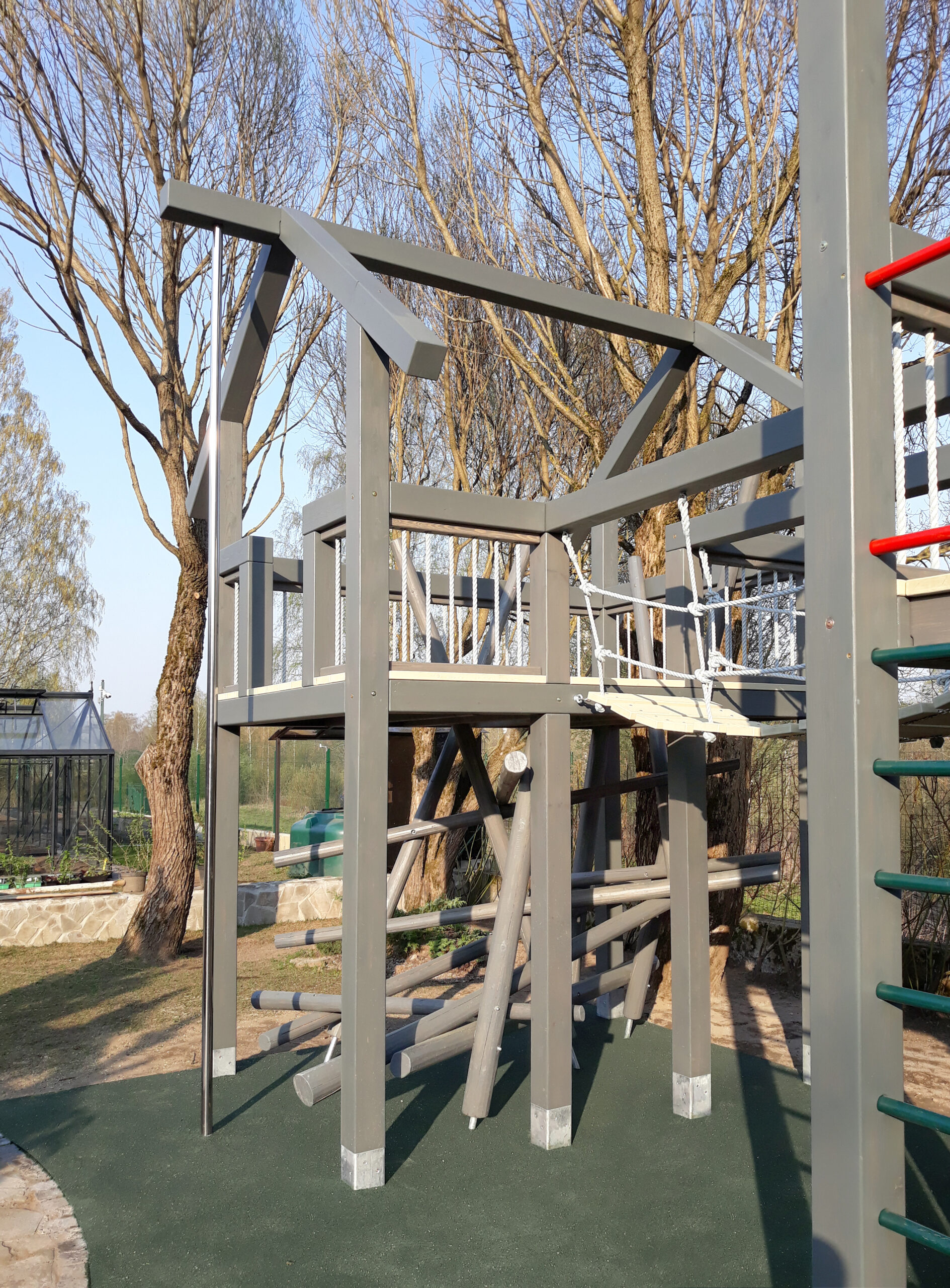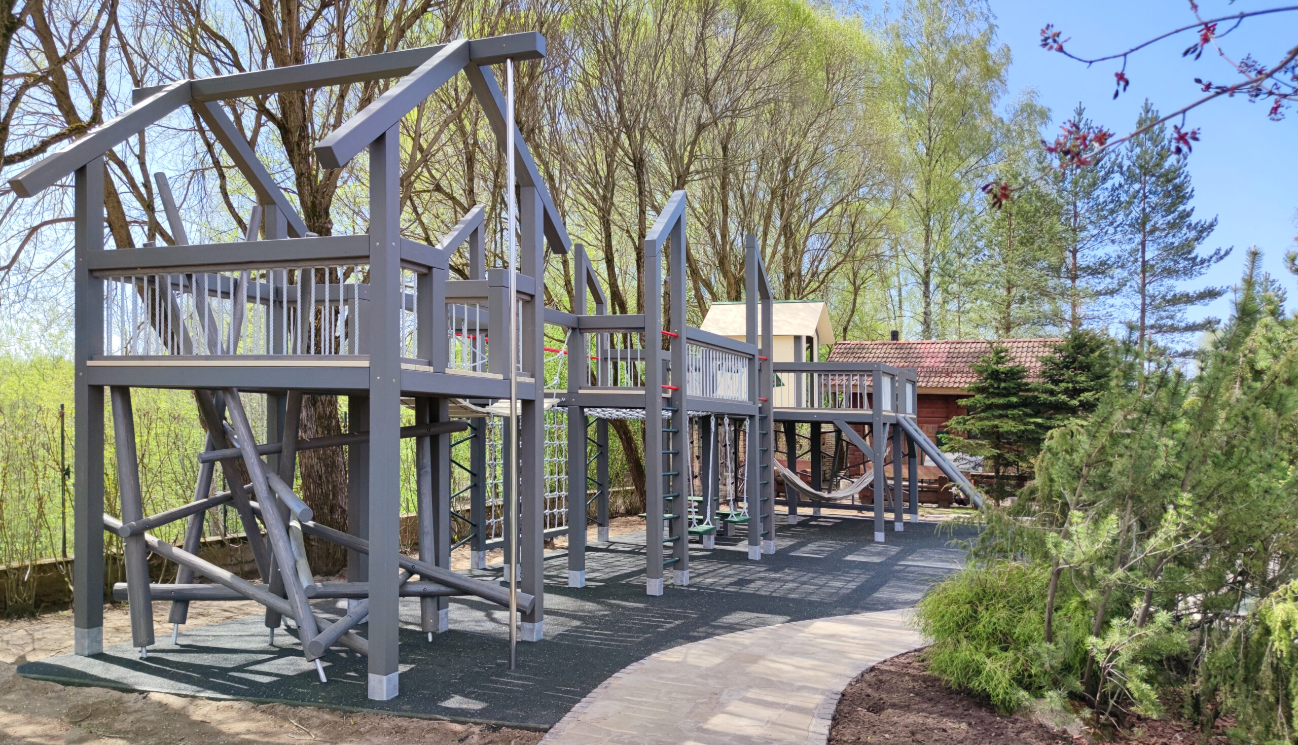 Так, ажурные стены из досок служат поверхностями для лазанья, а круглые брёвна используются в качестве ступеней, переходов и деталей лабиринта, создавая цельную, прочную и визуально выразительную игровую среду.