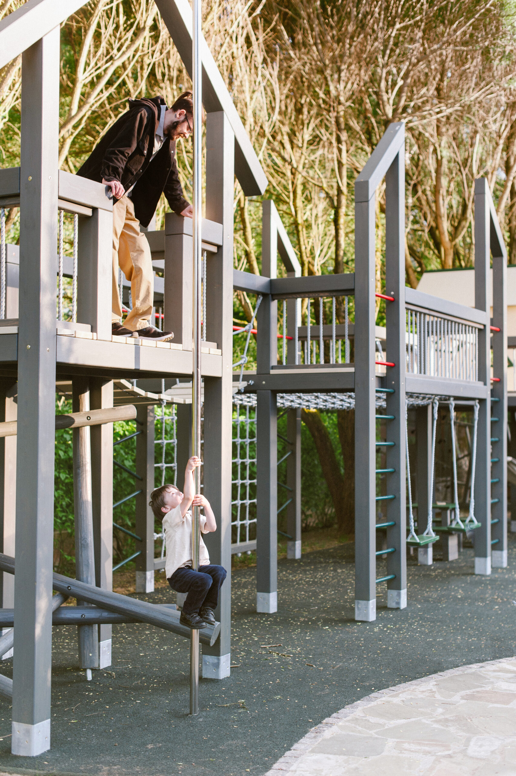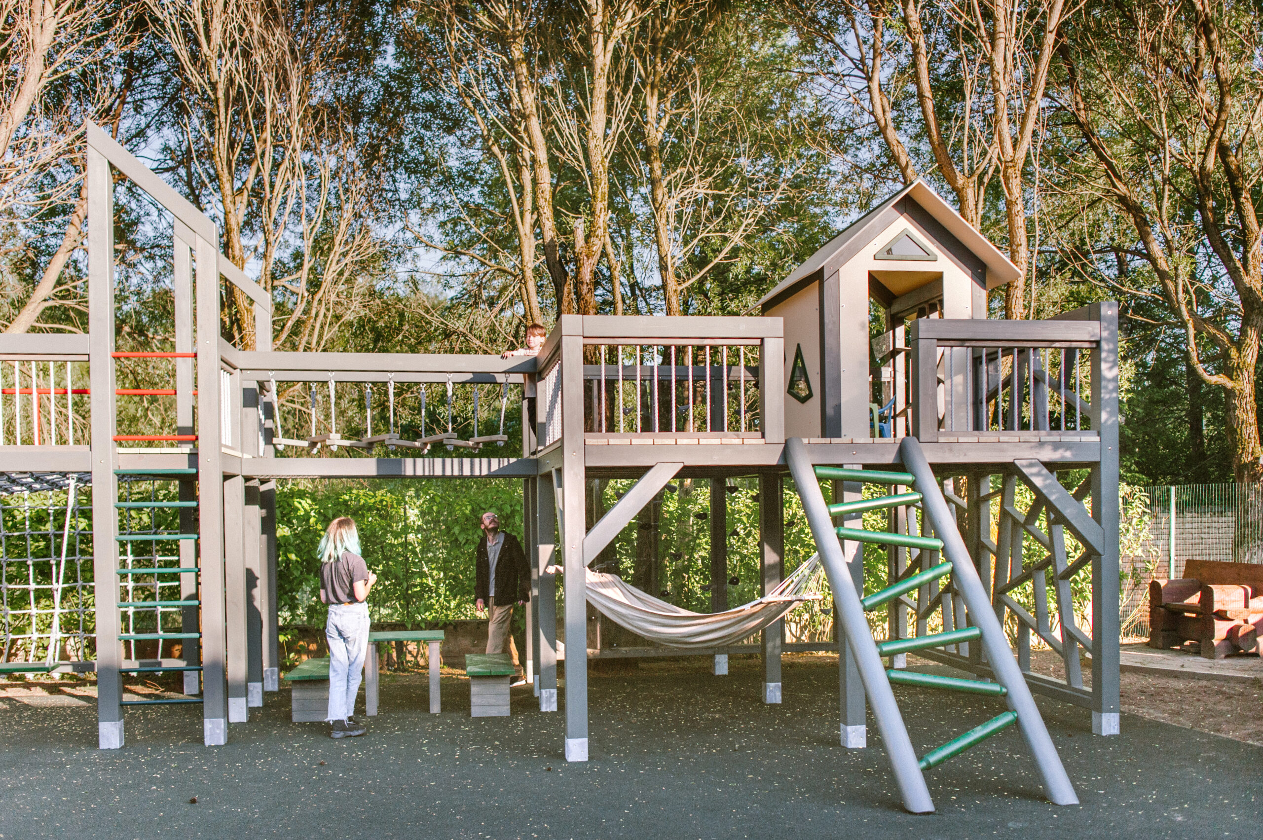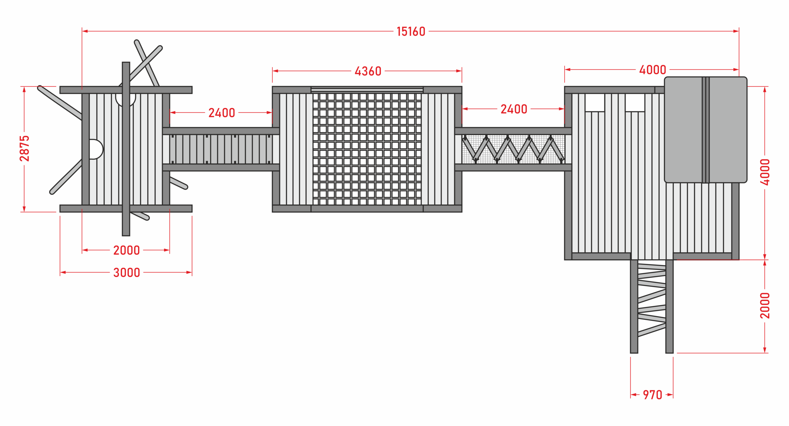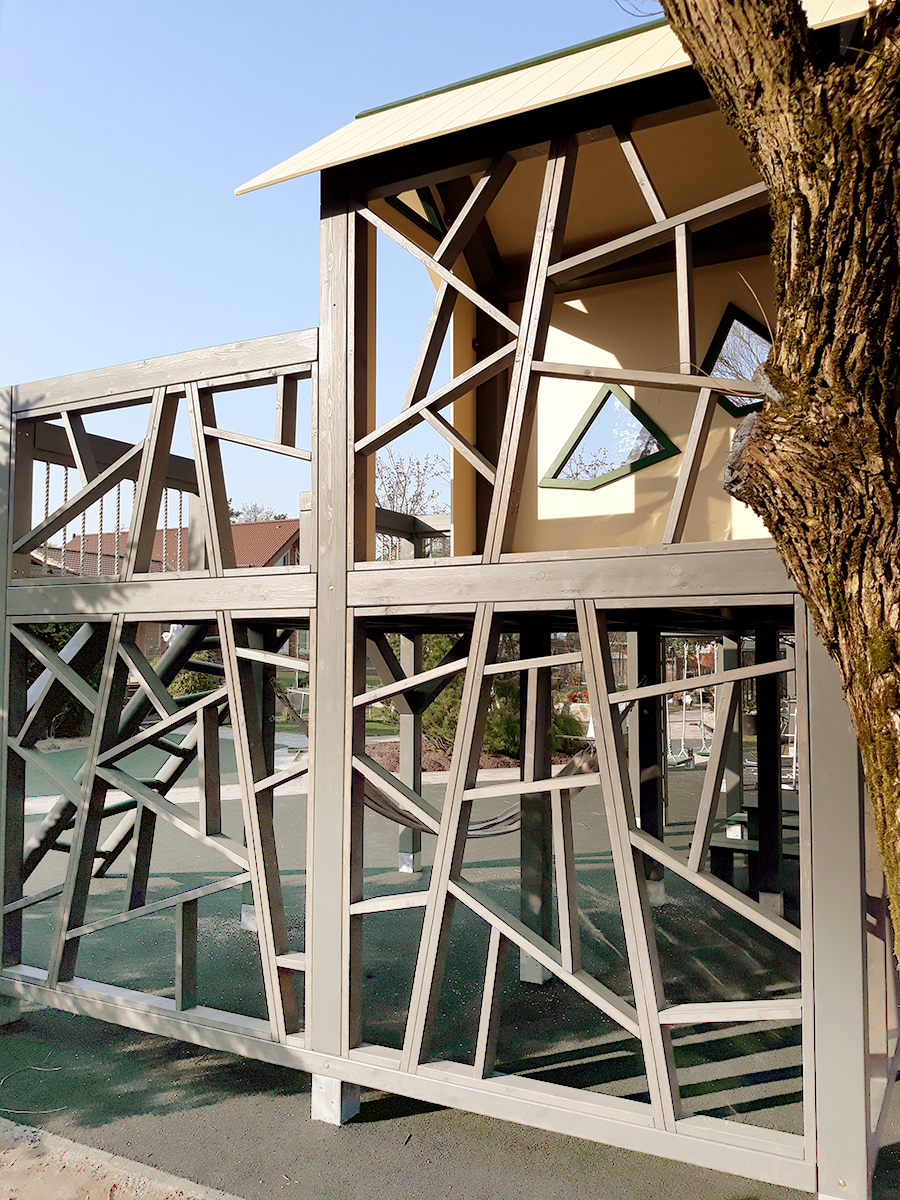 Так, ажурные стены из досок служат поверхностями для лазанья, а круглые брёвна используются в качестве ступеней, переходов и деталей лабиринта, создавая цельную, прочную и визуально выразительную игровую среду.