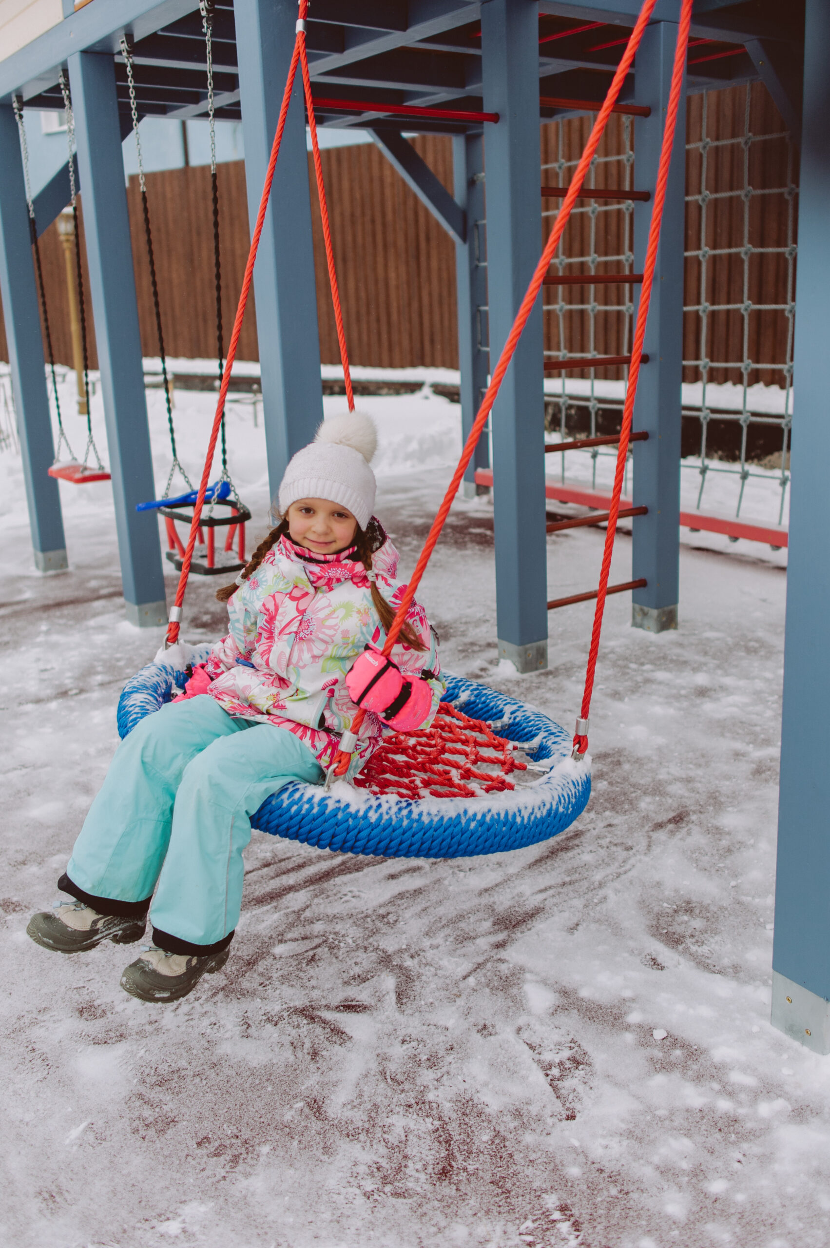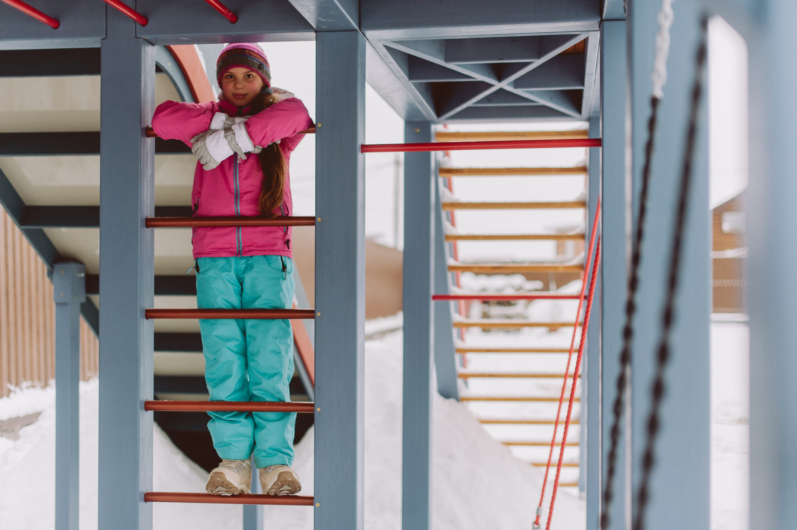 Особенностью проекта стала его высота и продуманное расположение вдоль забора — конструкция не только выполняет игровую функцию, но и закрывает собой здание на соседнем участке. Это было еще одно пожелание Заказчика с целью сохранения уюта и эстетического облика участка.