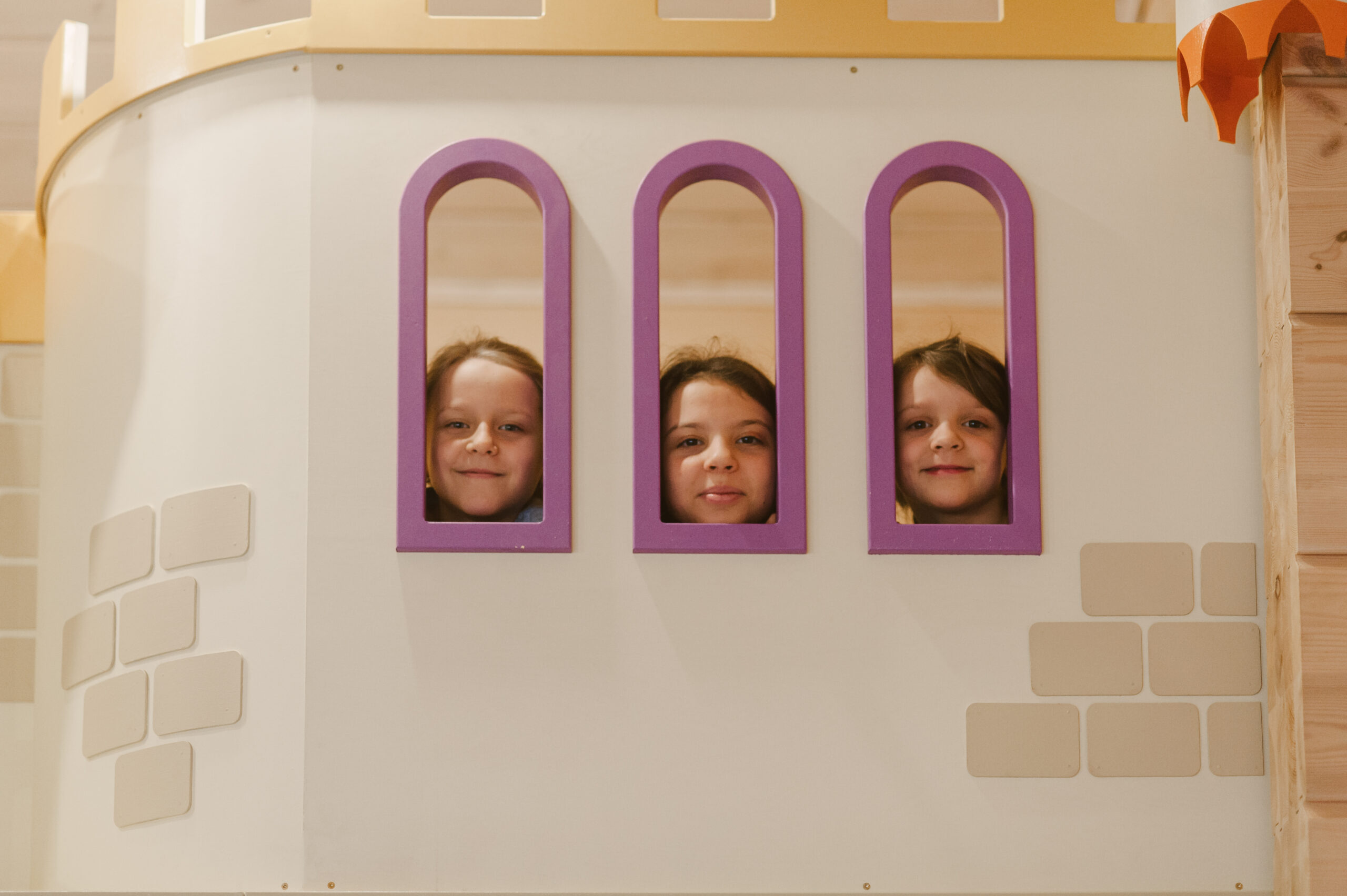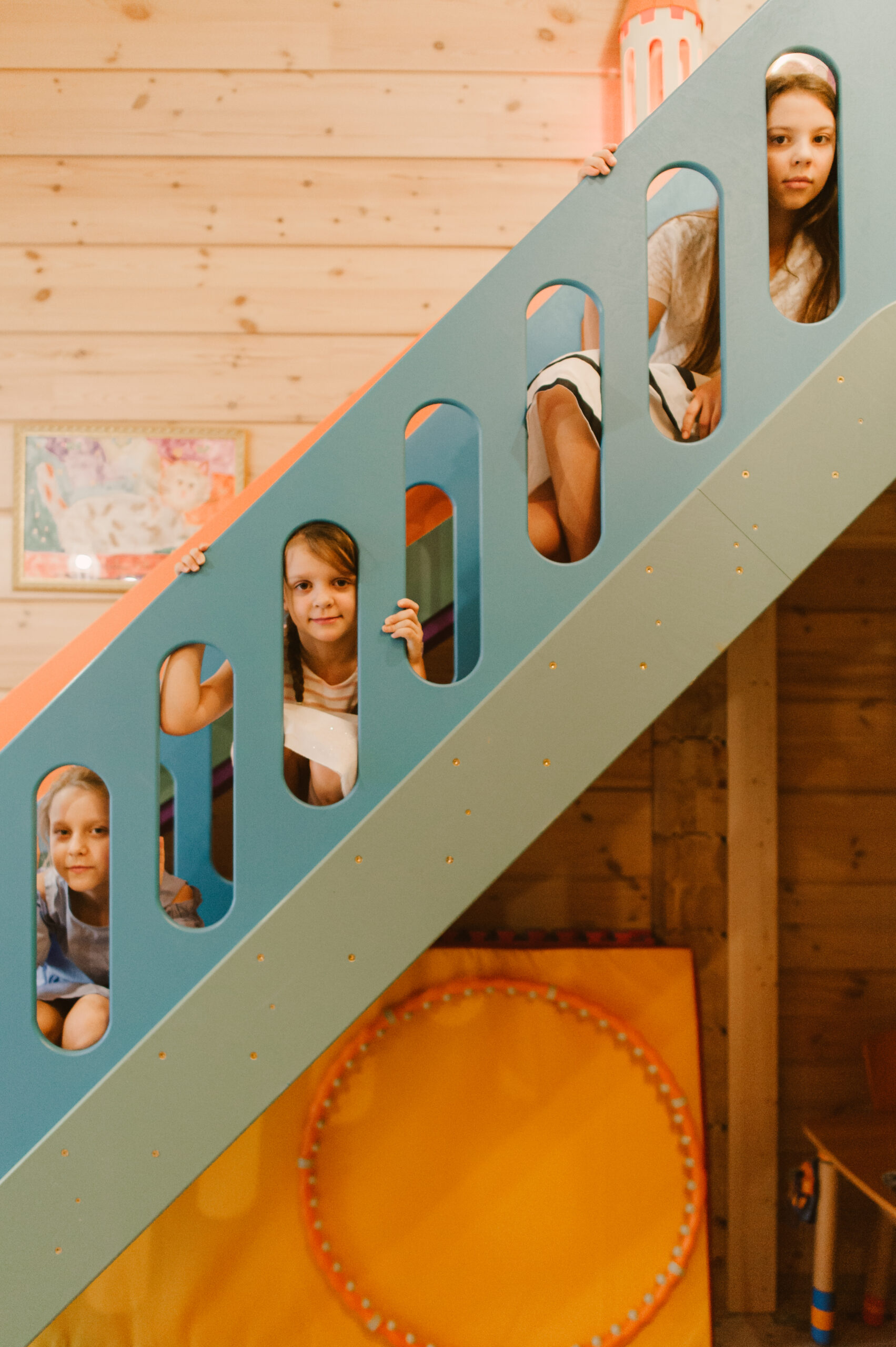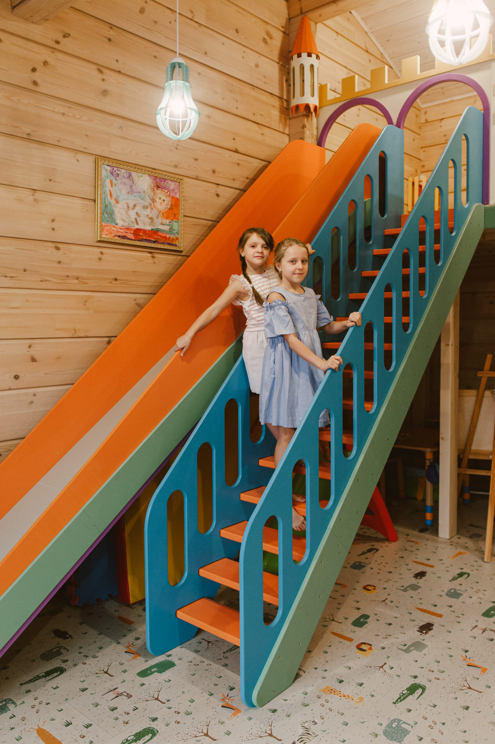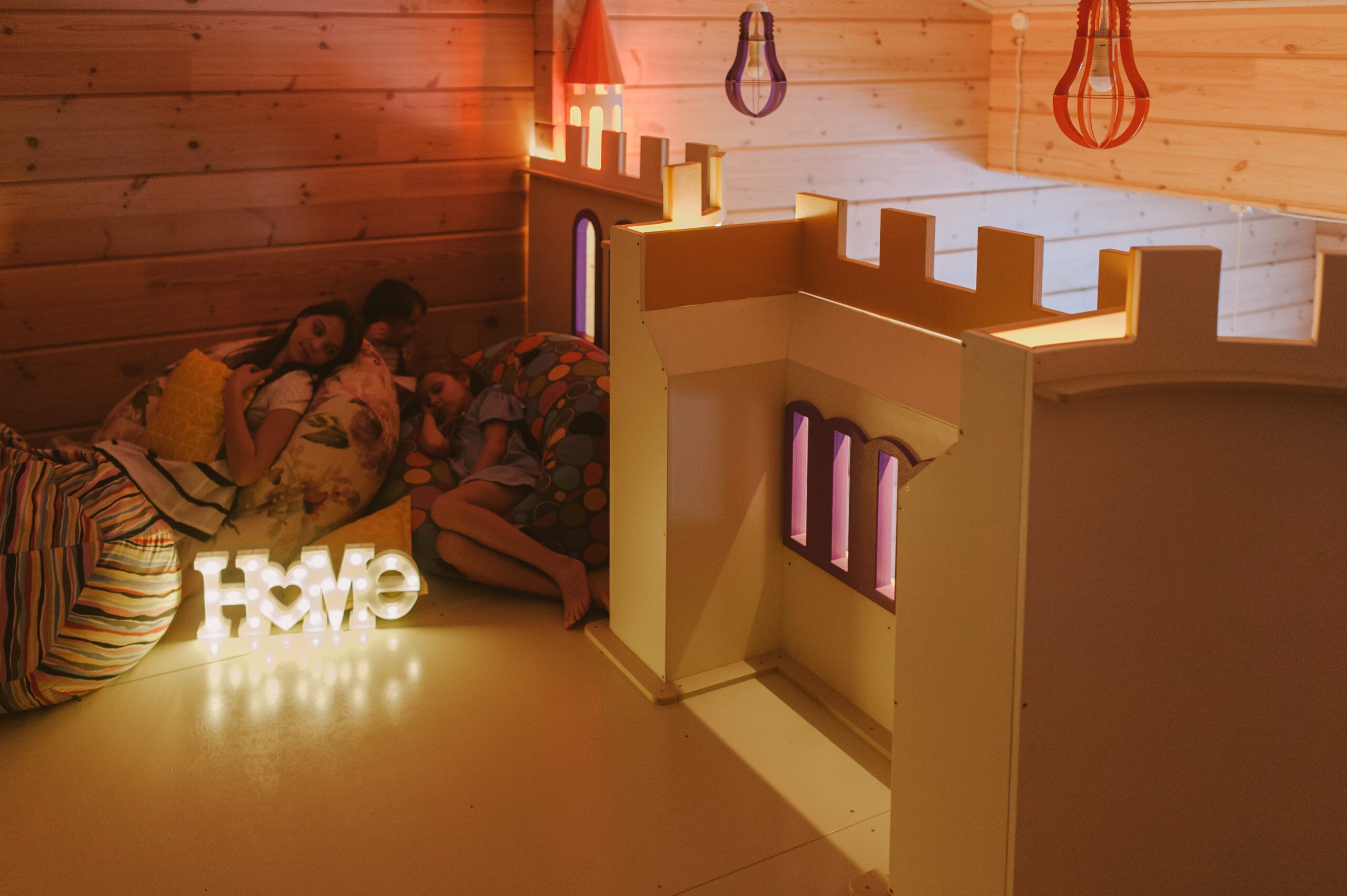 Проект задумывался как уютное и волшебное место для игр двух сестер. Просторная комната с высоким потолком и вторым светом вдохновила на создание многоуровневого игрового пространства — замка с башнями и горкой, соединяющего воображение и функциональность. На втором уровне расположилась укромная зона для игр и отдыха — мягкий уголок с подушками, где можно читать, мечтать и играть в «тайное королевство». Спуститься вниз можно по широкой горке. Фасад замка стал ярким интерьерным акцентом: декоративная стена с фактурой камня и встроенным светом фонарей создаёт атмосферу настоящего сказочного города. Пространство получилось не только красивым, но и продуманным — каждая деталь работает на комфорт, безопасность и игру. Этот проект — о детстве, фантазии и семейном тепле. Он объединил в себе архитектуру, игру и уют, превратив комнату в место, где хочется оставаться подольше.