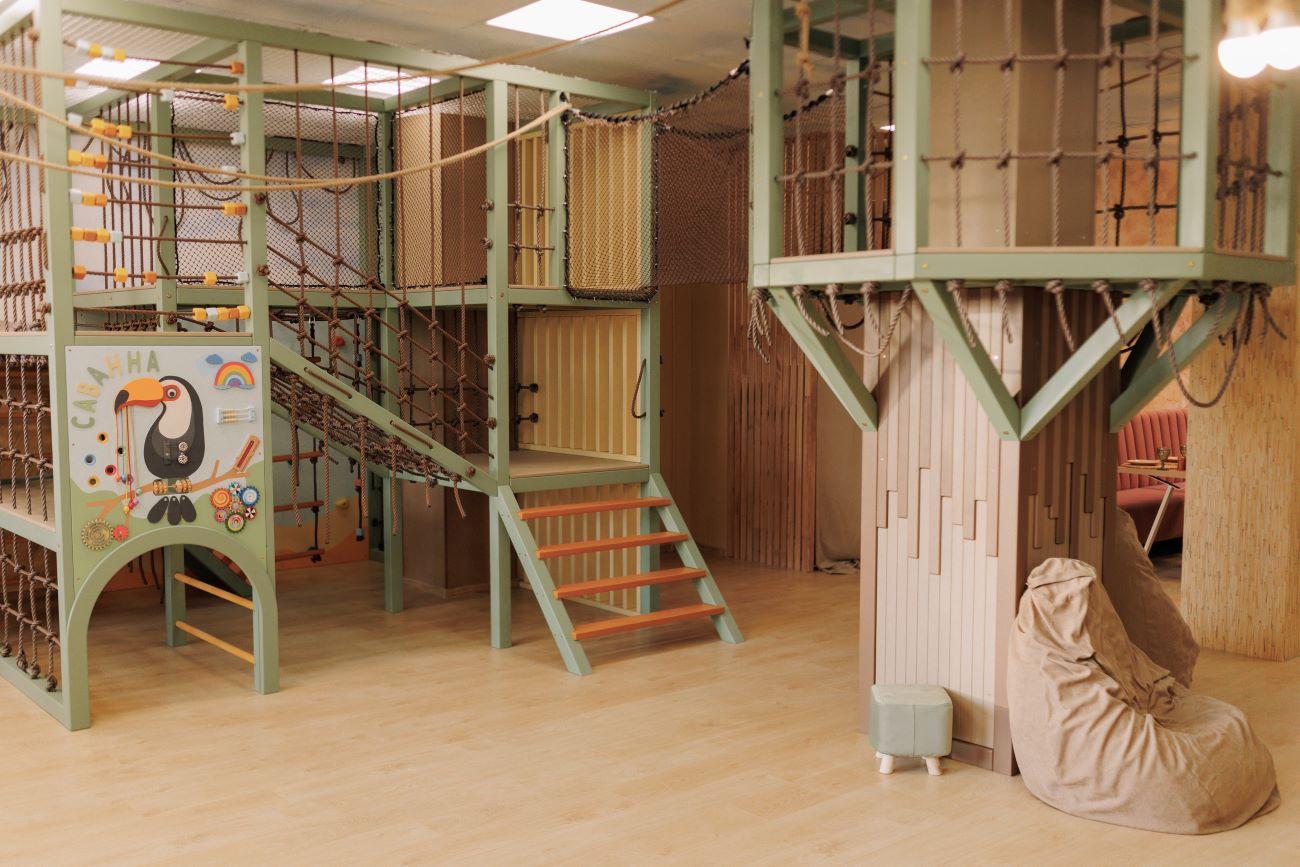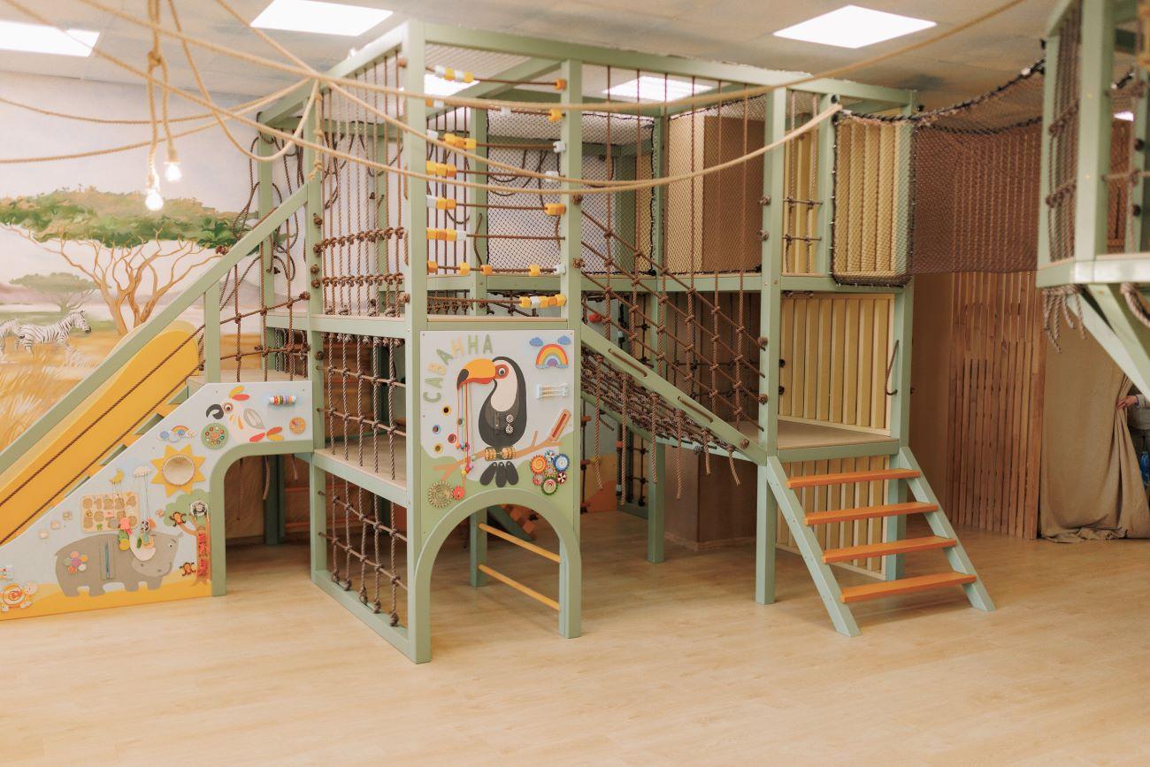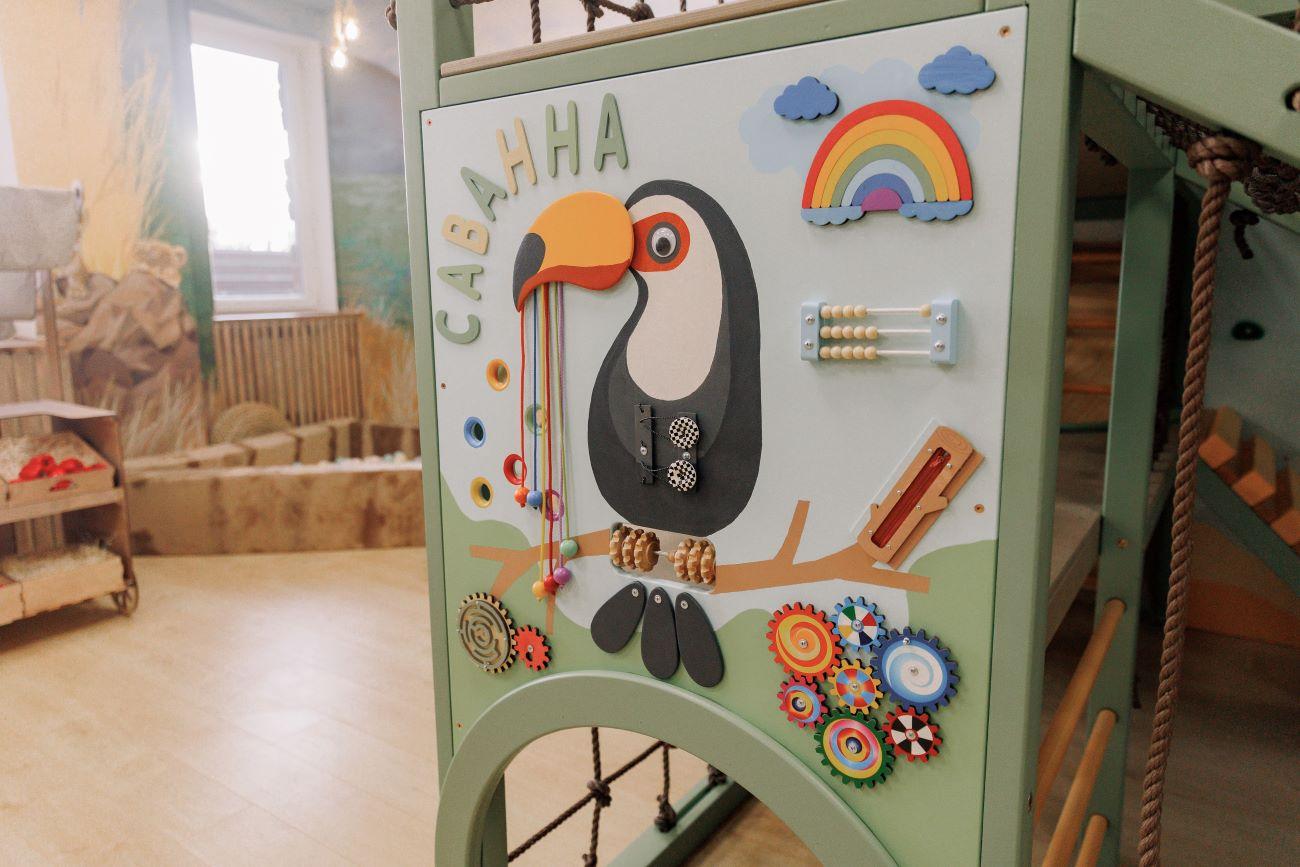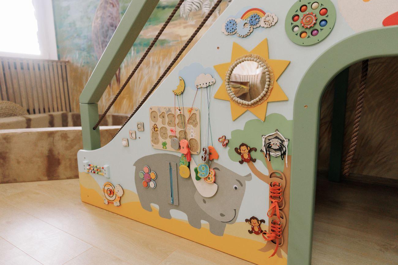 В зоне установлены специальные бизиборды для развития малышей и другие уникальные игровые элементы. Художественное оформление дополнено авторскими рисунками, создающими атмосферу приключений.