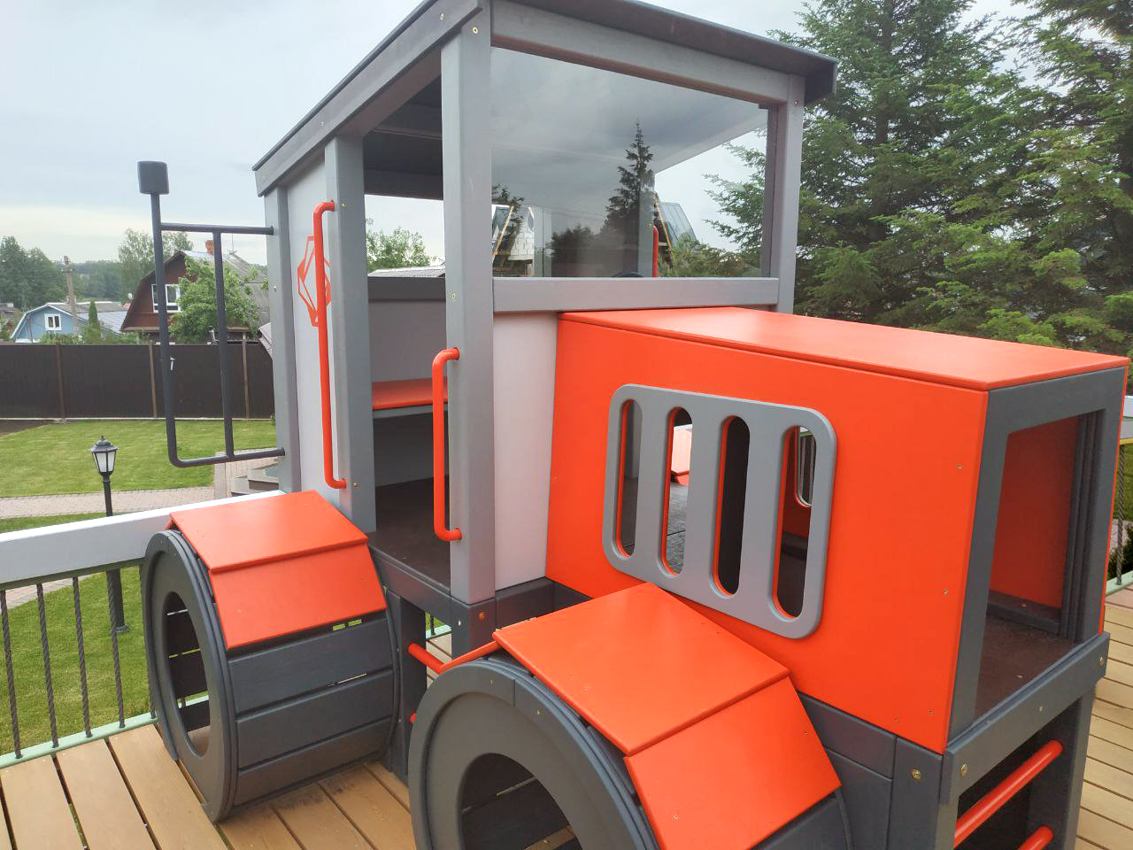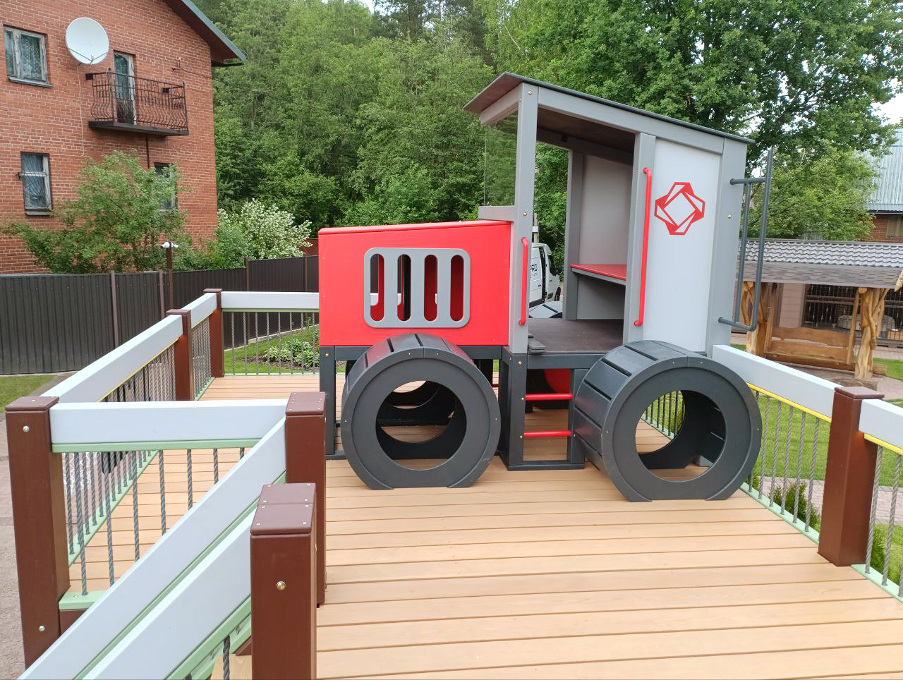 Центральным элементом верхней площадки стал домик в виде трактора легендарной модели Кировец. Это совместное с Заказчиком решение, имеющее большее значение чем просто придумка какой-нибудь машины.