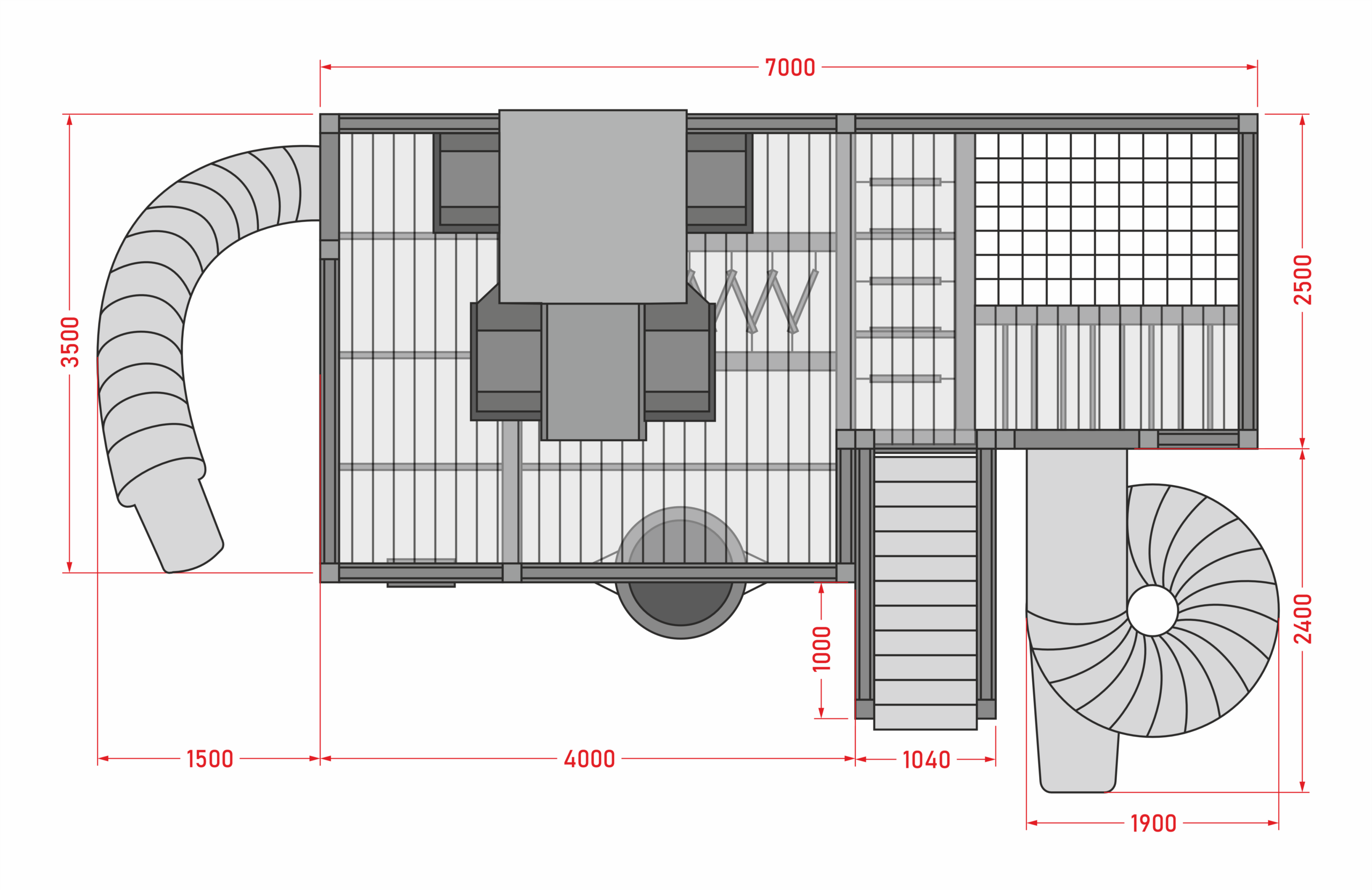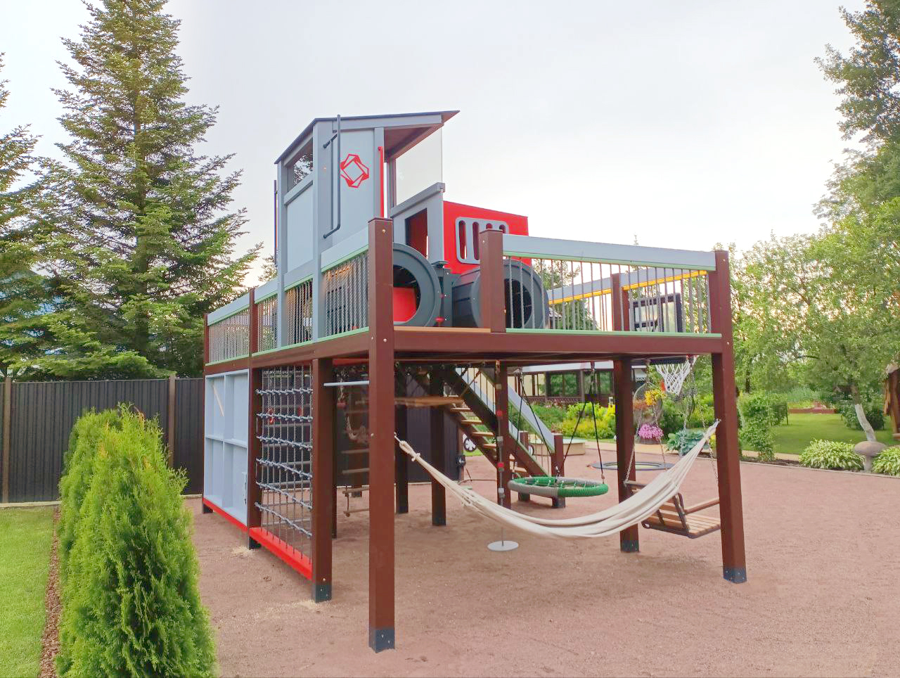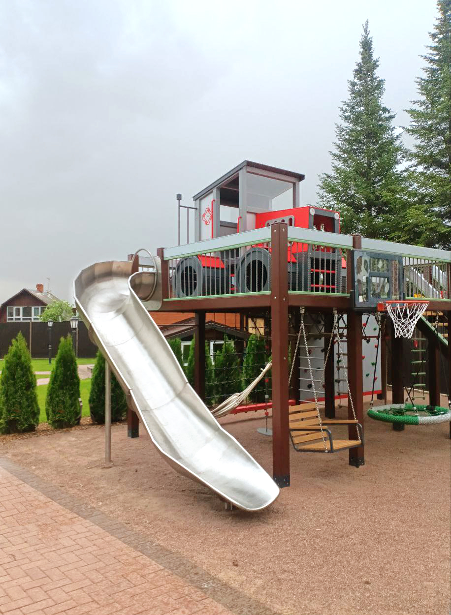 Конструкция объединяет в себе возможность активных действий и комфорт — здесь есть большая туннельная горка и горка желоб, стена для скалолазания, а также зона с гамаком и деревянными качелями. И много чего ещё.