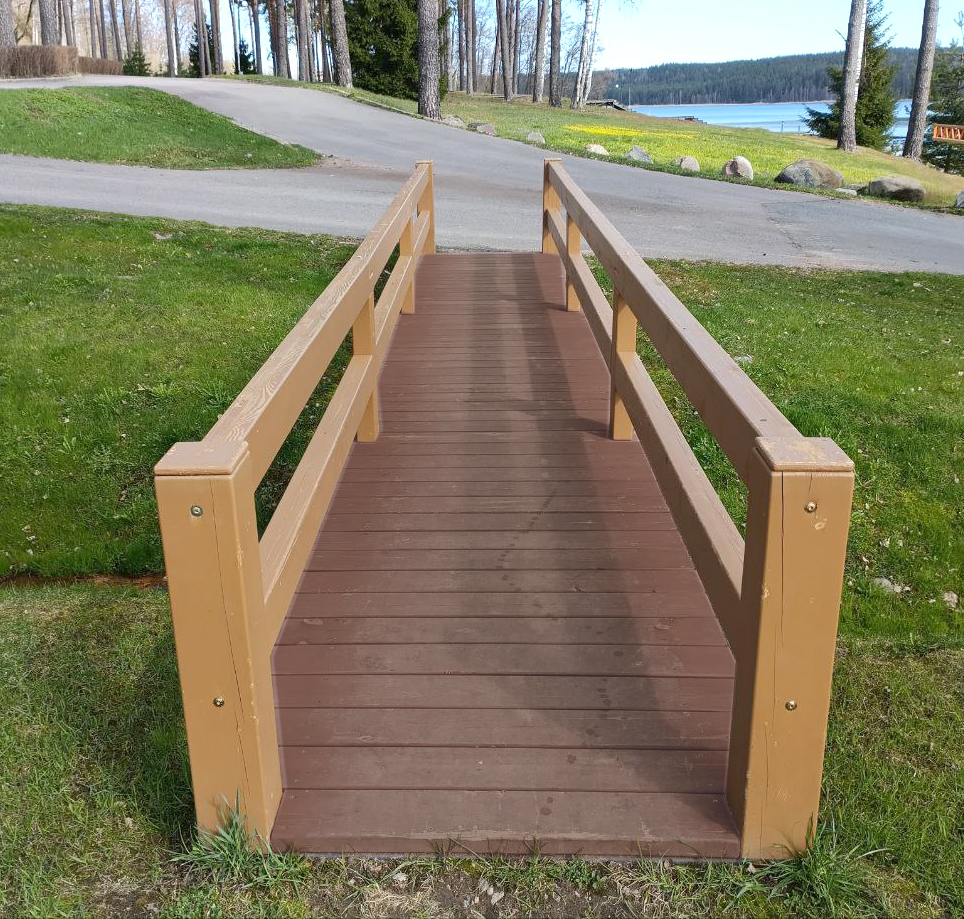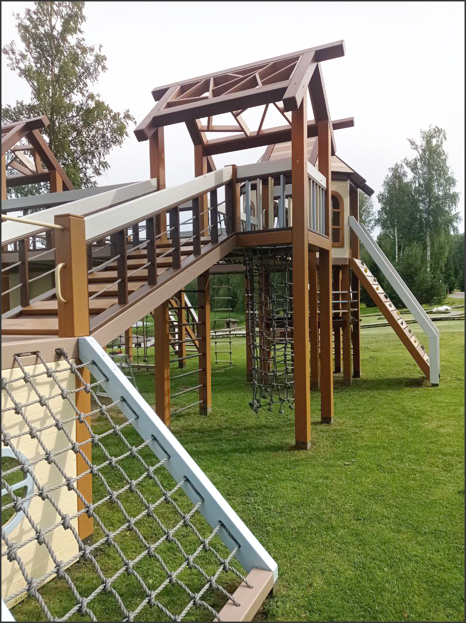 Конструкция выполнена из клееного бруса. Тёплые оттенки фасадов гармонично сочетаются с зеленью газона и стволами сосен неподалеку. Рядом с комплексом установлены качели и удобные скамейки. Таким образом и дети при деле и родителям есть откуда наблюдать с комфортом.