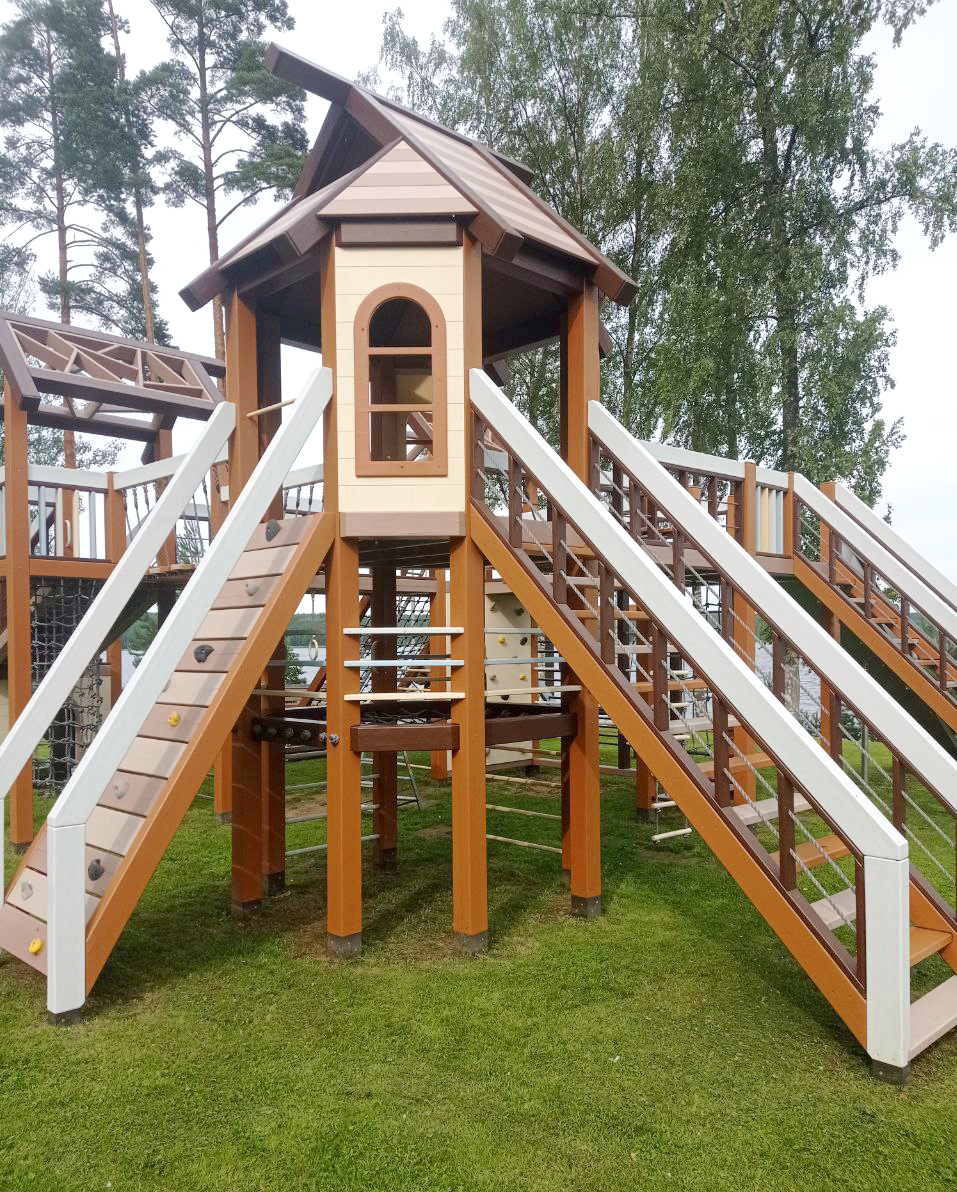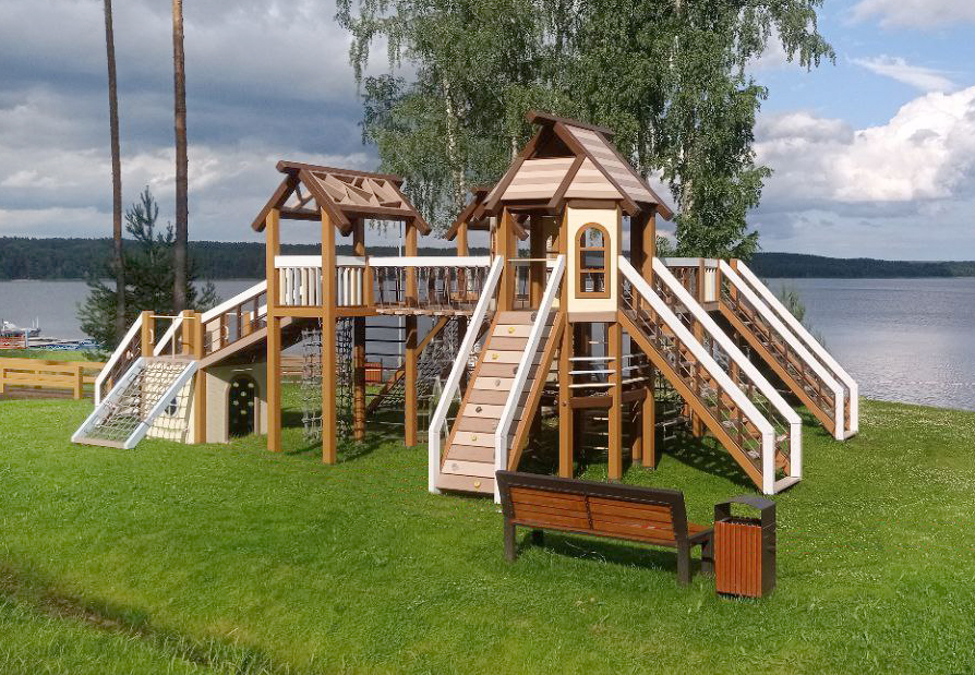 Проект представляет собой масштабный деревянный игровой комплекс, выполненный в уютном классическом стиле, который идеально дополняет природный ландшафт у воды. Архитектурная композиция строится вокруг двух высоких башен с традиционными двускатными крышами. Башни соединяются системой переходов и мостиков.