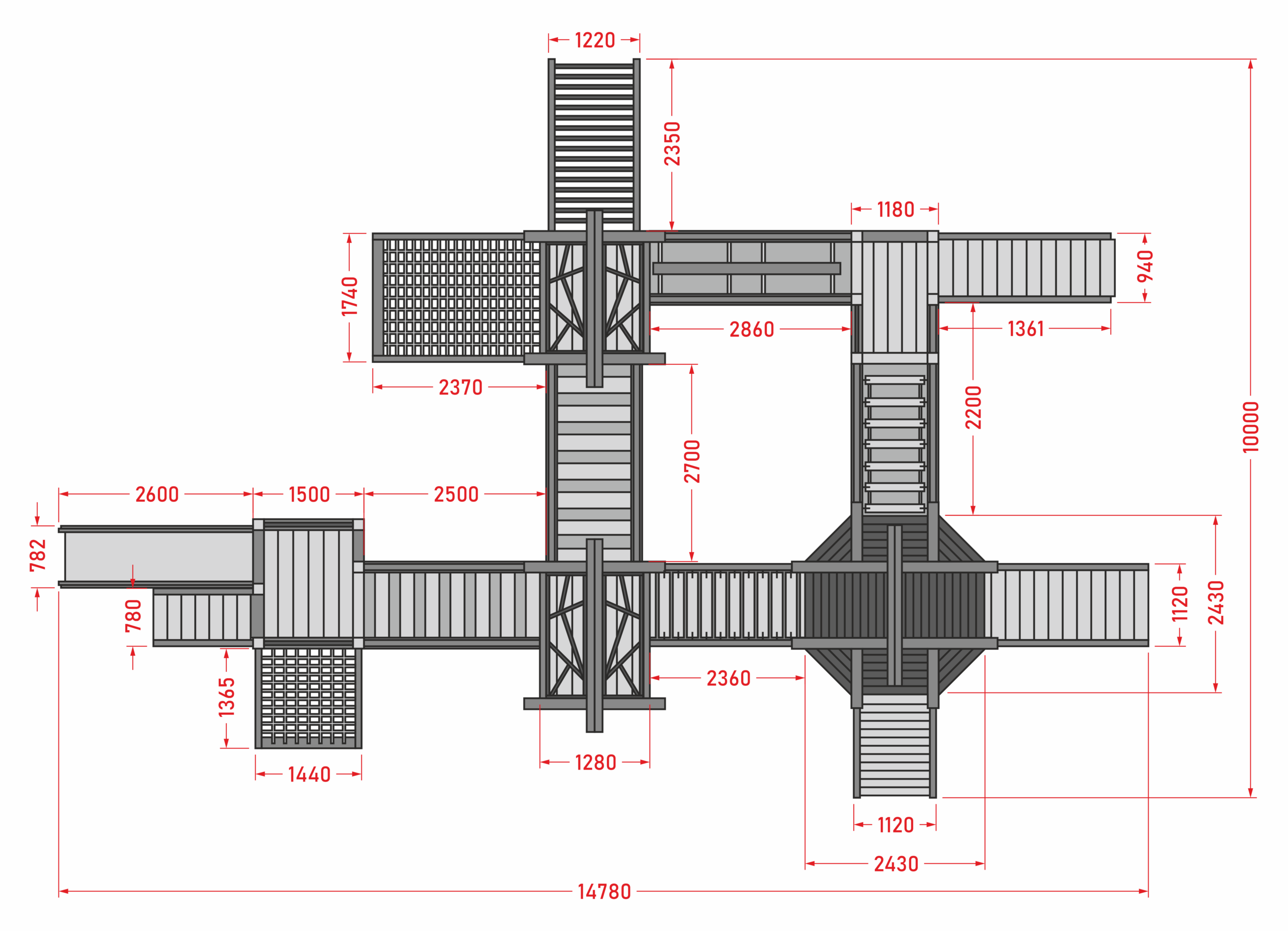 В комплексе предусмотрены разнообразные элементы: длинные металлические горки, наклонные скалодромы, веревочные сети и лестницы, препятствия со страховкой. Разнообразное оборудование, уровни и маршруты делают комплекс интересным надолго и многим.